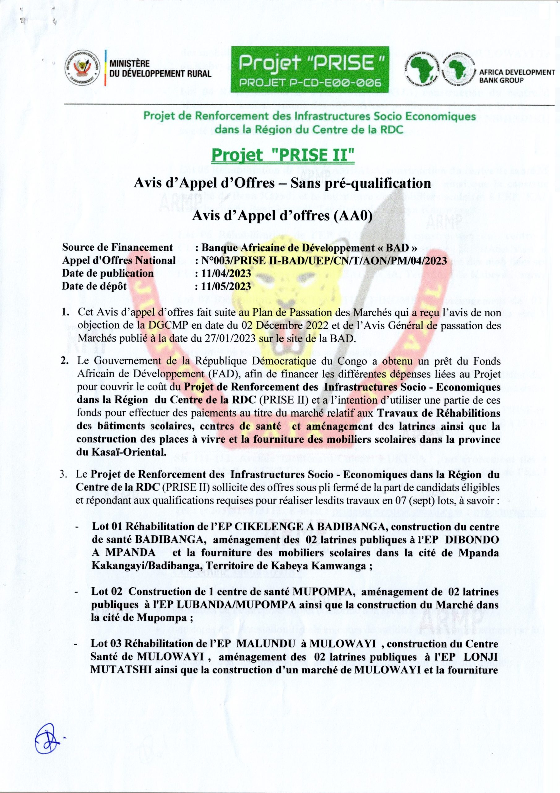 Travaux de réhabilitations des bâtiments scolaires, centres de santé et aménagement des latrines ainsi que la construction des places à vivre et la fourniture des mobiliers scolaires dans la province du Kasaï-Oriental.