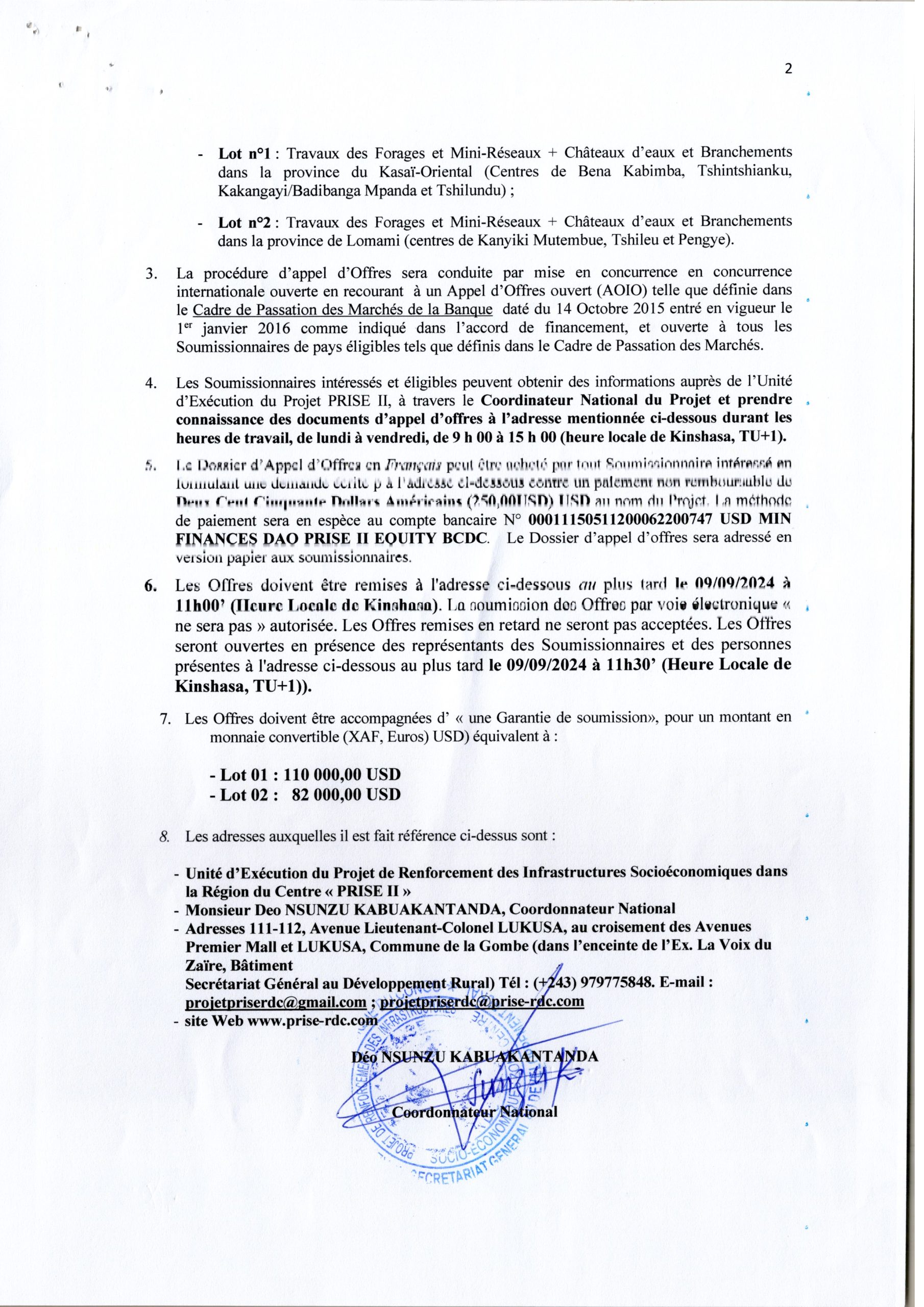 Travaux des forages et mini-réseaux + châteaux d’eau + branchements dans les provinces du Kasaï-Oriental et de Lomami (en lot n°01) : Kasaï-Oriental, Lot n°2 : Lomami